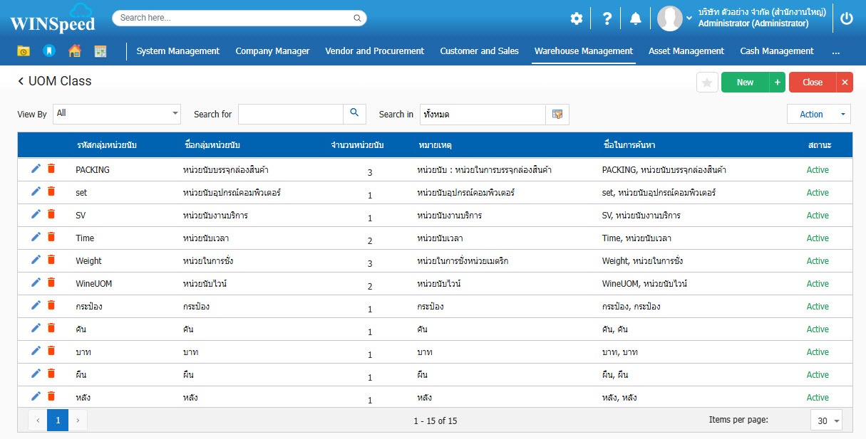 กำหนดกลุ่มหน่วยนับสินค้า (UOM Class) เป็นหน้าต่างสำหรับกำหนดกลุ่มหน่วยนับสินค้า ซึ่งมีการกำหนดหน่วยนับฐานและหน่วยนับ