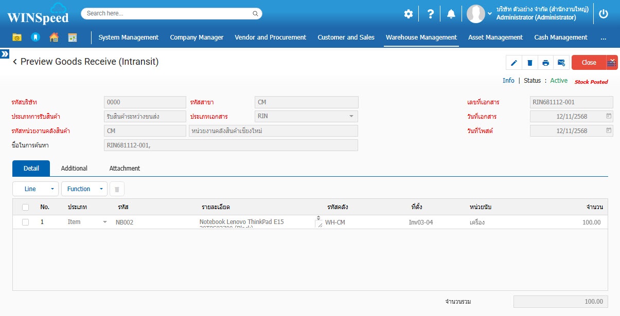 การบันทึกข้อมูลหน้าต่าง “รับสินค้า (อยู่ระหว่างการขนส่ง)” Goods Receive (Intransit) เป็นการบันทึกรับสินค้าที่ยังอยู่ในระหว่างการขนส่ง โดยพักไว้ในคลังระหว่างทาง